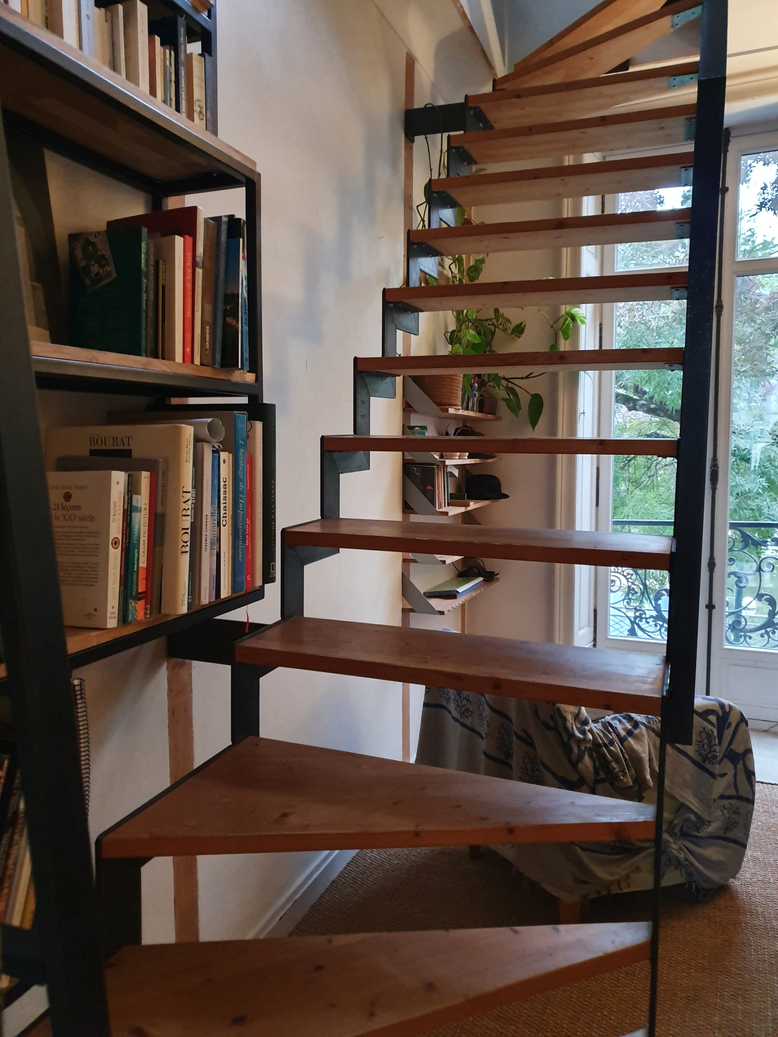 Premier niveau : entrée déservant un salon avec cheminée, une cuisine aménagée et équipée et un séjour dinatoire vue Erdre, salle de bains, toilettes et 3 chambres- escalier avec bibliothèque permettant l'accès au second niveau